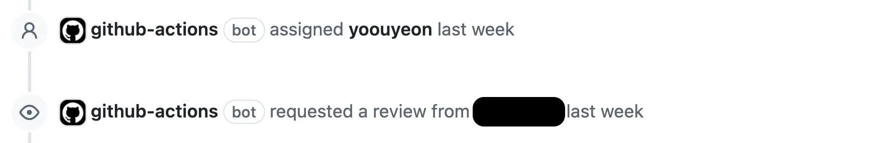 PR의 담당자는 github.actor로 이 워크플로를 트리거한 유저, 즉 이 PR을 오픈한 유저를 할당했고 리뷰어는 따로 정의한 워크플로 변수에서 후보를 가져오도록 설정했다.