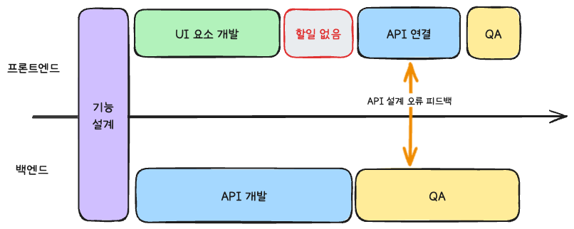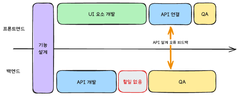 여기서 눈여겨봐야 할 부분은 프론트엔드의 개발 영역이 둘로 나뉜다는 것이다. 한 부분은 API와 크게 관련 없는 UI 요소 개발이고, 나머지 한 부분은 API를 활용해야 하는 부분의 개발이다. 예상대로 잘 프로젝트가 진행된다면 큰 문제가 없겠지만, 아래와 같은 상황이 된다면 조금 타격이 생긴다.