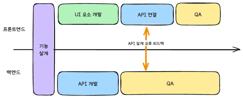 위 그림들에서 또 중요한 부분은 API 설계 오류 피드백이 개발이 절반 정도 진행된 시점, 심지어는 백엔드 입장에서는 개발이 모두 완료된 이후에 가능하다는 것이다. 만약 API 설계에 심각한 문제가 있다면, 그동안의 코드를 모두 갈아엎어야 하는 대참사가 발생할 수도 있고, 그 작업은 배포 거의 직전에 수행되어야만 하는 산 넘어 산의 상황이 된다.