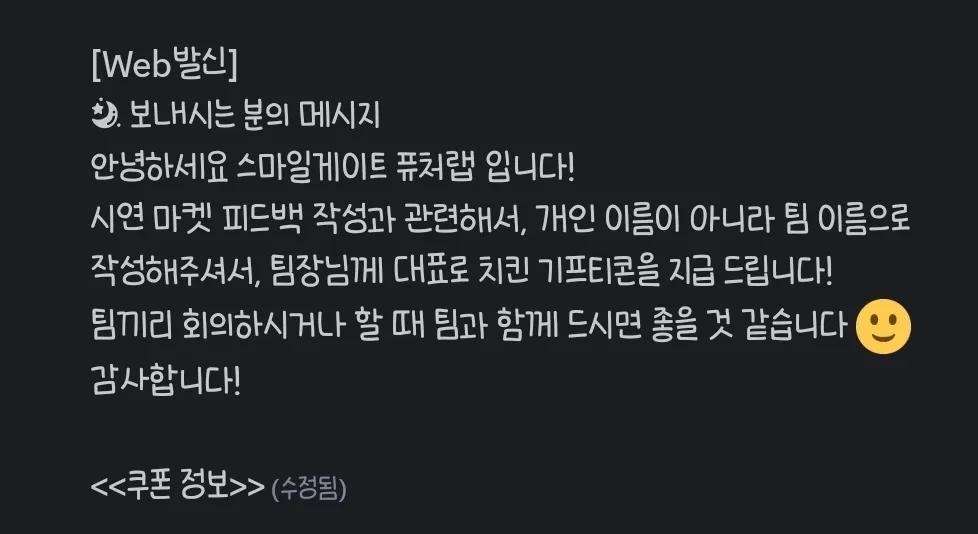 시연마켓 중에 다른 부스들을 돌아다니면서 피드백을 작성하는 활동이 있었는데, 정성 들여 쓴 피드백을 좋게 봐주셨는지 팀 이름으로 치킨 기프티콘을 받았다 ㅎㅎ