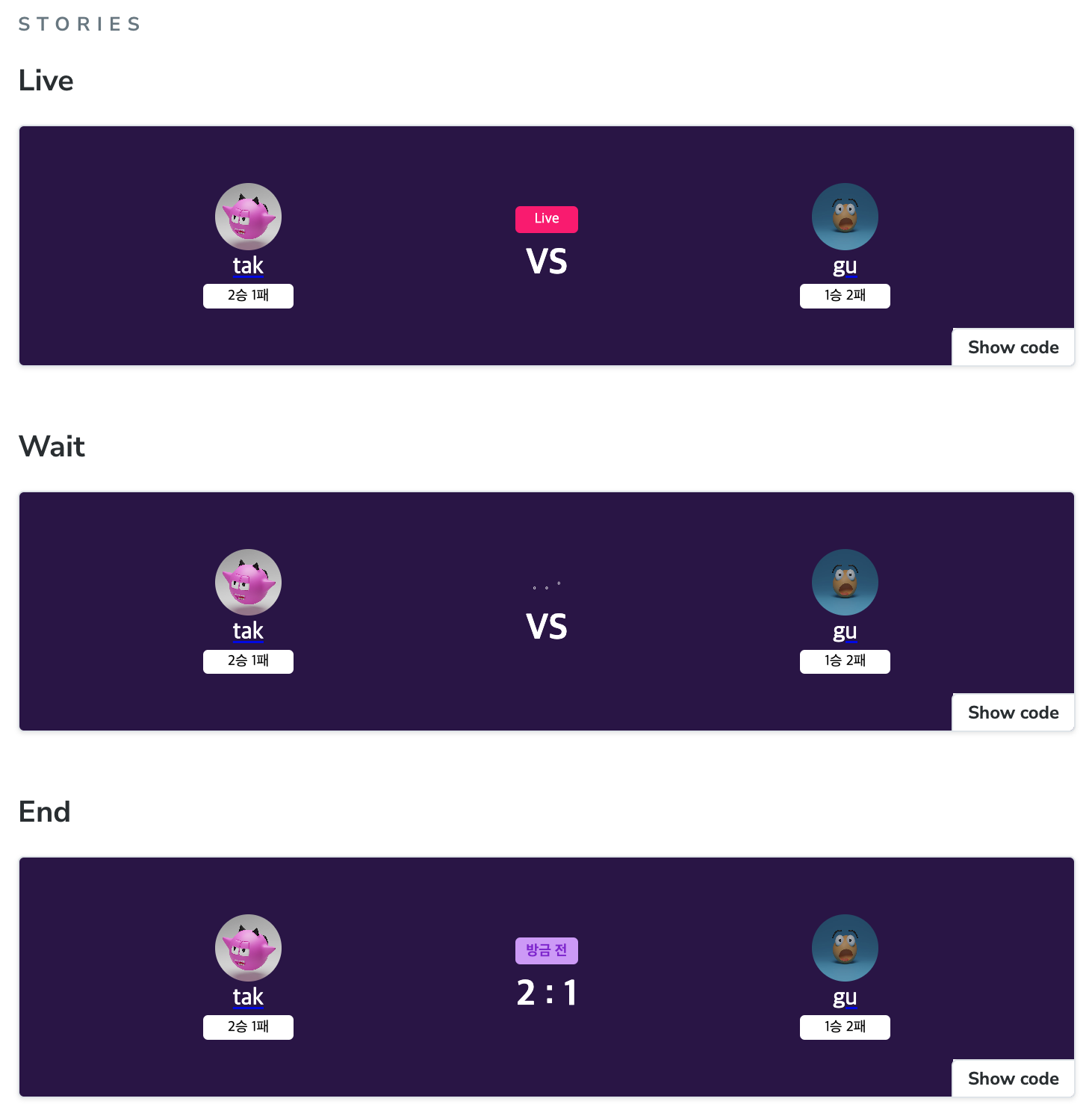 이때 스토리북을 이용해서 스토리를 아래처럼 각각의 상태에 맞게 스토리를 만들면 외부의 변화를 기다릴 필요 없이 각 상태의 컴포넌트를 확인하며 개발할 수 있다.